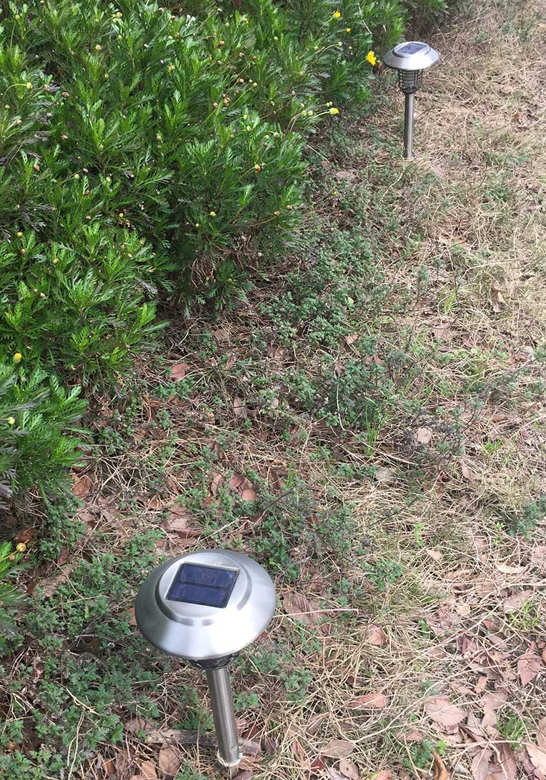 上圖:小區(qū)太陽能滅蚊燈配地插,在綠化帶處可以直接插在土里使用。
