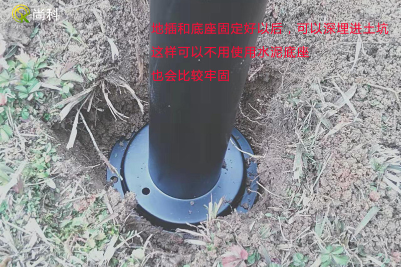 上圖:安裝師傅很有經(jīng)驗(yàn),把地插跟底座連接后插在土坑里,既牢固又美觀,還省事省力,不用水泥底座