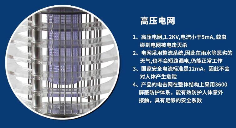 上圖:室外滅蚊燈MW-5A高壓電網(wǎng)1.2kv,蚊蟲碰到即可被殺死